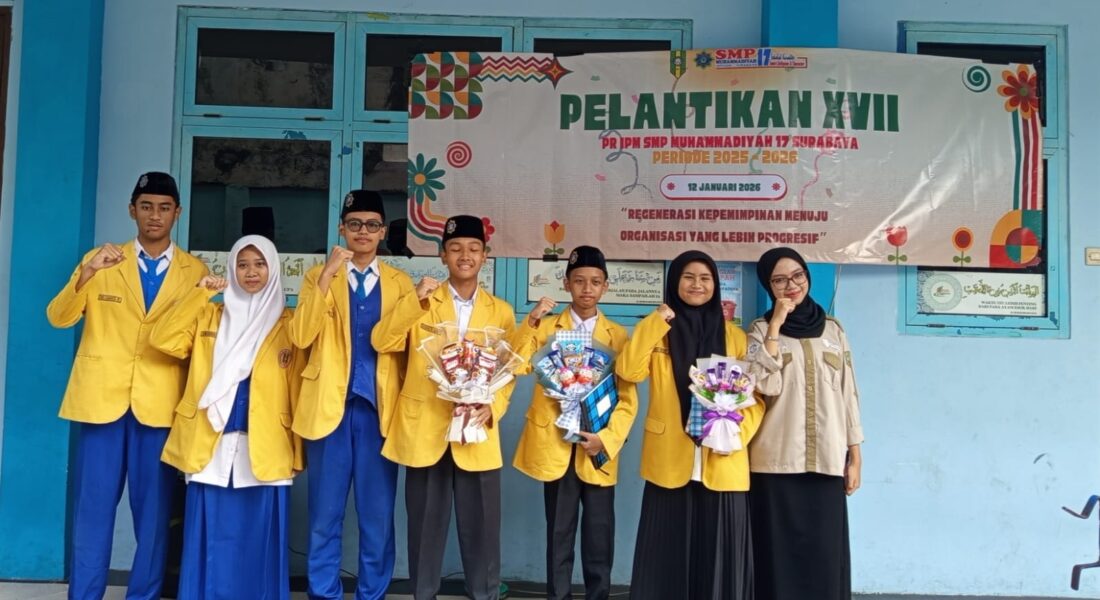 Pimpinan Ranting Ikatan Pelajar Muhammadiyah (PR IPM) SMP Muhammadiyah 17 Surabaya periode 2025–2026 berfoto bersama. (Purwanto/Klikmu.co)KLIKMU.CO – Suasana pagi yang khidmat mengiringi prosesi Pelantikan Pimpinan Ranting Ikatan Pelajar Muhammadiyah (PR IPM) SMP Muhammadiyah 17 Surabaya (Spemjitu) yang digelar di halaman sekolah, Senin (12/1/2026). Kegiatan ini disaksikan oleh seluruh siswa, guru, dan staf sekolah, sekaligus menandai dimulainya kepemimpinan baru PR IPM SMP Muhammadiyah 17 Surabaya periode 2025–2026.